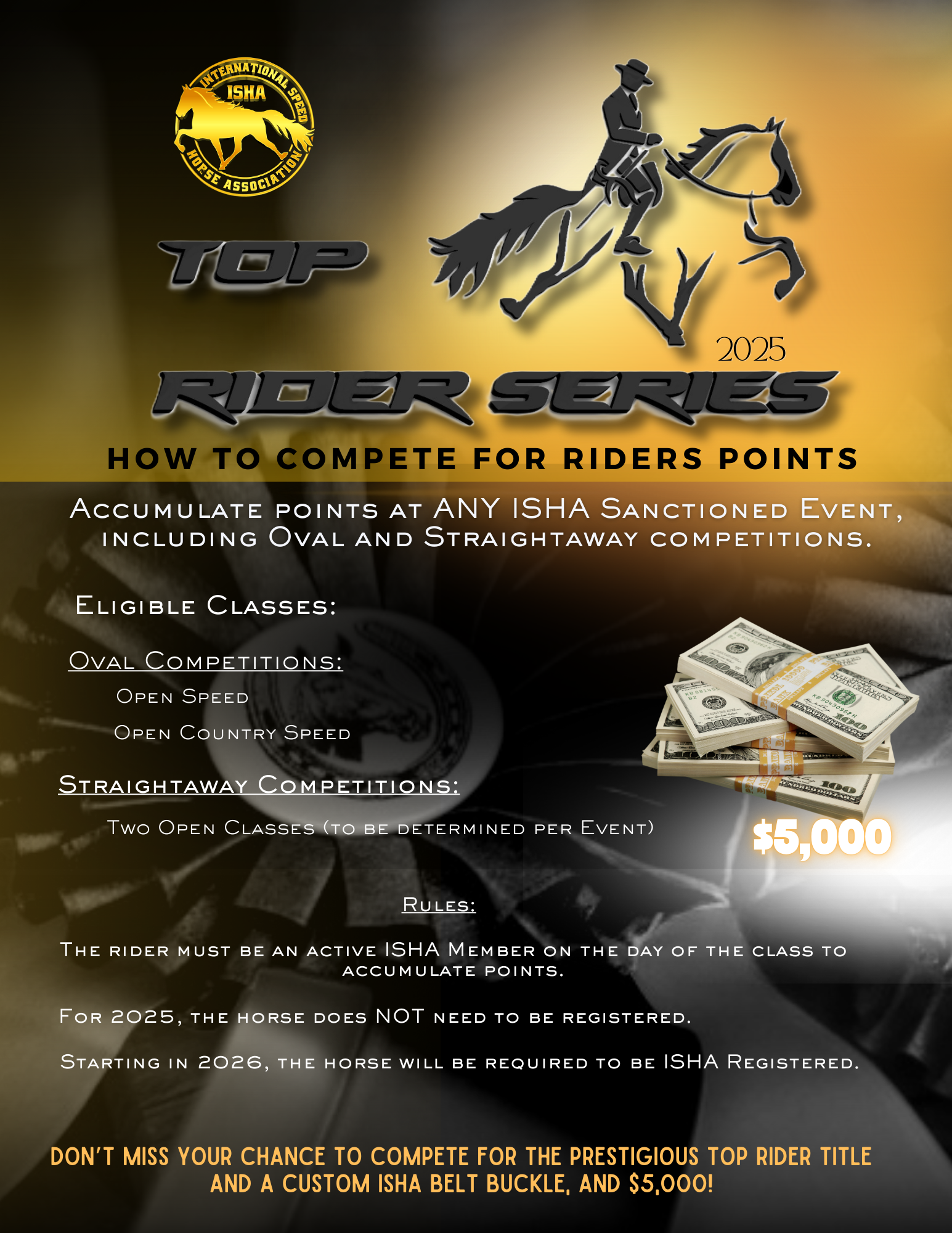 ISHA introduces their Top Rider Series for 2025! Don't miss your chance to be ISHA's Top Rider for 2025 with a prize of $5000 and custom belt buckle! Click here for more information.